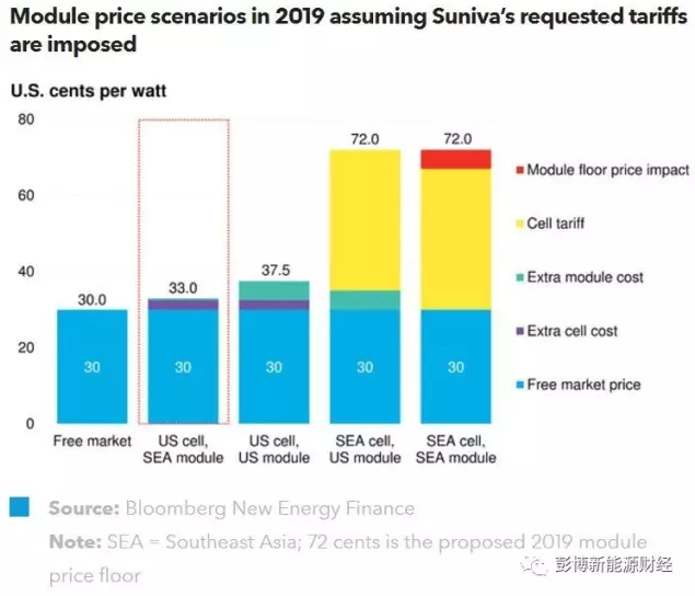 假设中国公司在美国投建的GW级光伏电池生产厂在2019年投产,并将生产的电池运往东南亚或墨西哥封装成组件,则该组件相较于电池和组件都在东南亚完成的情景会产生大约3美分/W的额外费用。假设这笔额外费用直接反映在产品售价上,在美国的组件售价会被抬高约10%。