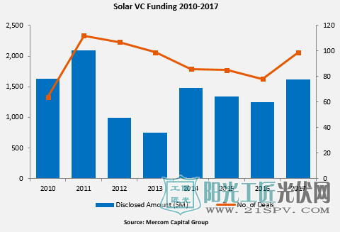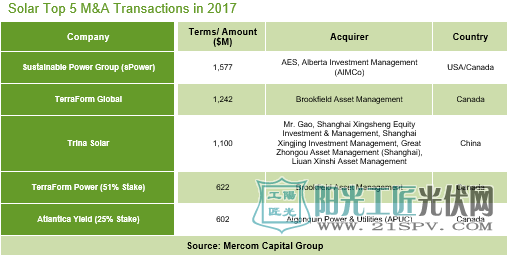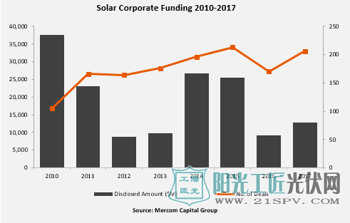 最主要的筹资项目包括:SunlightFinancial,Sunnova,SolarMosaic,SolarCity和SpruceFinance。自2009年以来,提供租赁,购电协议和贷款的太阳能住宅和商业公司已经筹集了超过248亿美元的租赁和贷款资金。2017年太阳能行业共发生71宗并购交易,较2016年的68宗交易略有上升。