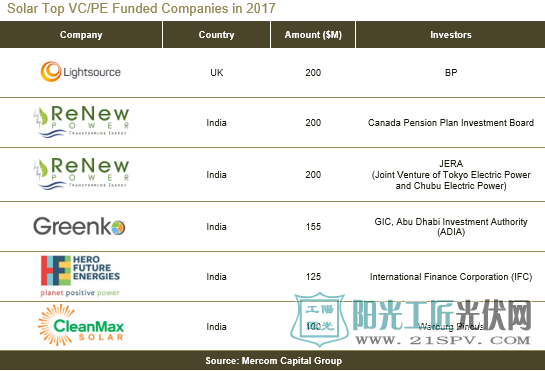 其中,单笔金额最大的VC/PE交易是LightsourceRenewableEnergy签署的2亿美元交易。此外,ReNewPower还签署了两单分别达到2美元的融资协议。其次是GreenkoEnergy,融资1.55亿美元,HeroFutureEnergies筹资1.25亿美元,CleanMaxSolar筹资1亿美元。在2017年六大太阳能风险投资基金交易中有五个来自印度。2017年共有162家VC/PE投资者参与了资金轮投资,其中包括Engie,AvistaDevelopment,DSMVenturing,InnoEnergy,Innogy,国际金融公司(IFC),壳牌和Techstars等8家公司参与多轮融资。