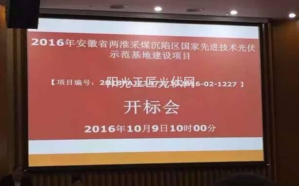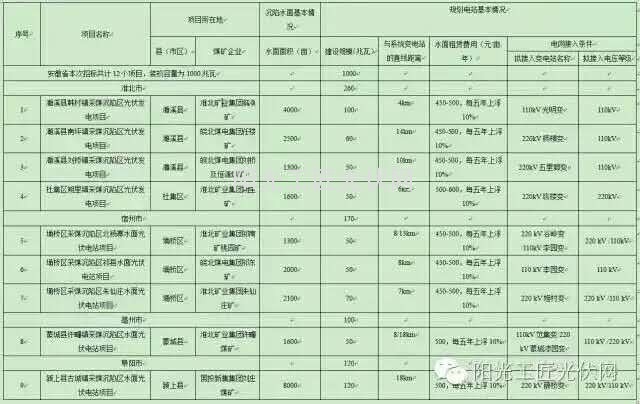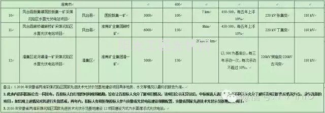 2016年9月18日,安徽省招标集团股份有限公司受安徽省能源局的委托,对“2016年安徽省两淮采煤沉陷区国家先进技术光伏示范基地建设项目”在安徽合肥公共资源交易中心进行公开招标。指出,此次招标的建设总规模为1000MW(即100万KW),由淮南、淮北、阜阳、亳州、宿州等五市境内12个项目组成,共1个标段,建设方式为漂浮式水面光伏电站,同时要求中标项目所采用的主要设备(光伏组件)应满足“领跑者”技术指标要求。规划如下