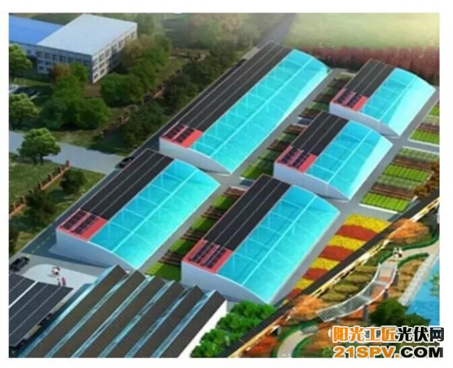 联栋温室大棚:每座大棚占地面积6000m2(不包括前后道路面积5110 m2),安装容量492.8kW;大棚棚顶呈南北向布置,南侧棚顶布置光伏组件,组件推荐选用单晶硅280W高效组件;