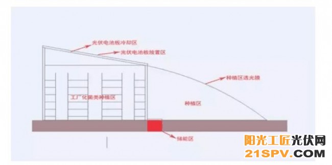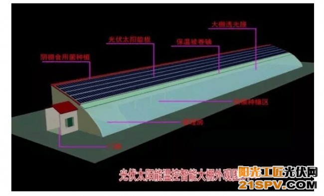 多功能棚属于智能光伏农业。棚前做冬暖大棚种植植物,棚后做工厂化食用菌养殖,棚顶发电。一棚三用,能量循环、节水、节地、节能。