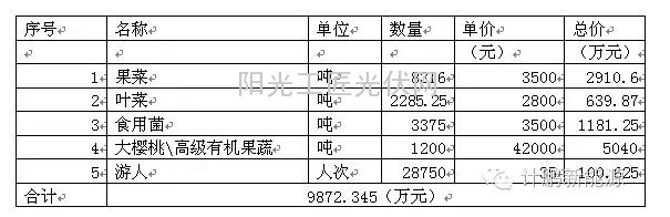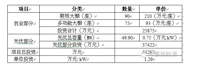 联栋温室大棚棚体单位造价约为350元/m2,多功能大棚平均单位造价约为310元/m2,项目整体造价估算见下表所示: