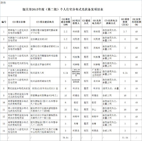 一、为进一步推进我市分布式光伏发电应用,同意你局报来的韶关市2015年度(第三批)个人住宅分布式光伏发电项目备案。本次备案个人住宅分布式光伏发电项目14项,合计装机容量76.84千瓦(详见附件),纳入我市2015年度分布式光伏发电新增建设规模。
