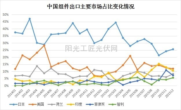 日本一直是中国组件出口的最大目的国市场,也是世界上最大的光伏应用市场之一。2015年第1季度,日本占中国组件出口份额为41%。此后整体呈下跌趋势。到第4季度日本的份额已降至24%。日本份额的下降主要由于日本光伏市场增长的放缓。2015年4月后日本的FIT收购价格大幅下降,而组件成本的自然下降又不足以弥补IRR的降低,从而抑制了装机量的增长。