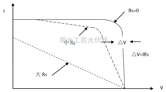 串联电阻Rs 影响短路电流,Rs 增大会使短路电流降低,而对开路电压没有影响。串联电阻的影响如图2。