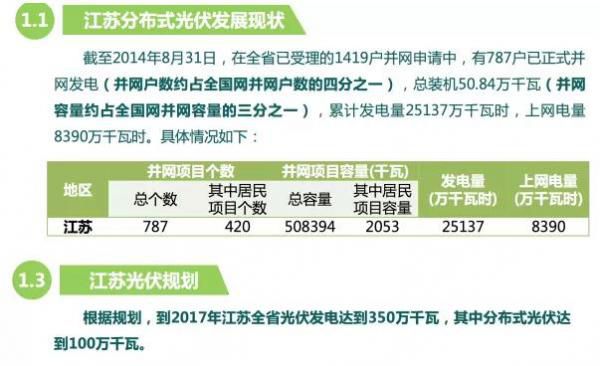 截止到8月31号,江苏全省申请光伏总数是1419户,总的容量达到111.5万千瓦。在这么短的时间里,从江苏发展的数量和容量来看都是非常了不起的,而且随着光伏造价的降低,未来可能是一个更快的趋势。根据规划,到2017年江苏省将有1500千瓦的装机。