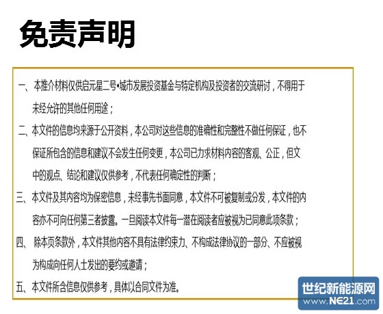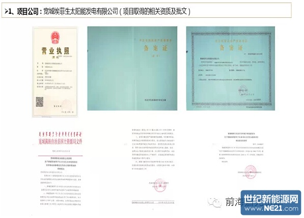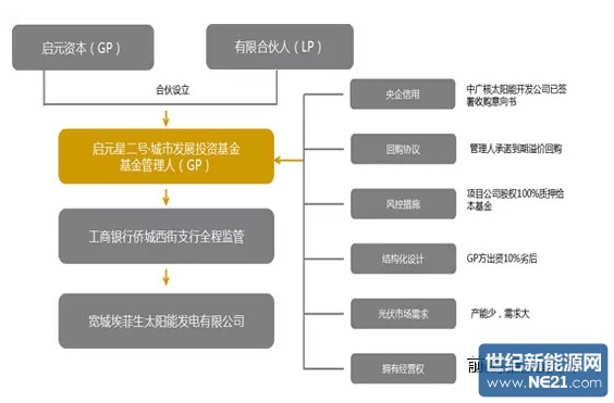 | 保障措施 | 保障一: 中广核太阳能开发有限公司收购(已签署光伏发电站收购意向书) 保障二: 定向投资于埃菲生能源河北宽城苇子沟乡20MWp并网光伏发电项目 保障三: 宽城埃菲生太阳能发电有限公司将其100%的股权质押给本基金,以确保项目运作在本基金控制范围内 保障四: 根据国家相关文件及批文规定:宽城埃菲生太阳能发电有限公司享受电站经营权20年(预计6-7年收回投资成本) 保障五: 本项目建设工期为4-7个月,周期较短,资金回笼快 保障六: 工商银行华侨城西街支行全程监管,确保专款专用 保障七: 基金管理人启元资本将认购本基金的10%份额作为劣后 保障八: 基金管理人启元资本承诺到期溢价回购投资者的合伙企业份额 | ||