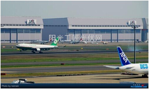 2010年东京羽田国际机场开始太阳能发电。其发电规模为2MW,年发电量达2GWh,每年可减少850吨的二氧化碳量。其约28000平方米的太阳能面板设置在机场国际线货运航站楼顶,约占大楼供应年用电量的10%。
