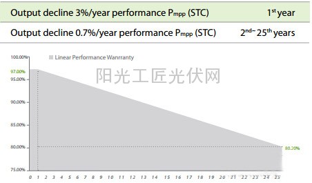 图4-1中第一年3%的总衰减数据取自正泰太阳能多晶硅组件的25年衰减保证当中,其25年衰减保证如图4-2所示,