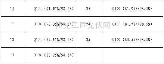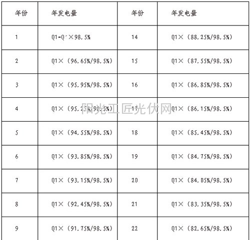 综合上述,光伏电站年发电量Q=额定装机功率P×组件平均效率η1×系统其它损失因素综合效率η2×峰值日照时间H×365天,在25年期限中,除了组件平均效率η1,其它项的乘积可视为一个不变的常数Q?,则最终的表达式为光伏电站年发电量Q= Q×组件平均效率η1(式5-3)。