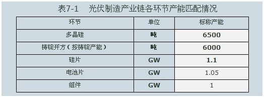 如果一家光伏企业试图实现全产业链的生产,最终只将组件外销的话,产业链内部各环节的产能,必须按照产能平衡的原则实现上下产业链各环节的产能配套。表7-1以1GW的组件输出产能为例,列出了光伏制造产业链中各环节的产能数据。