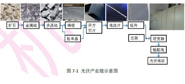 图7-1给出了光伏产业的从矿石到光伏电站的主产业链。从图中可见,光伏制造的产业链很长,从矿石、金属硅冶炼、多晶硅生产、多晶硅铸锭、硅片、电池片、光伏组件还有逆变器等各环节产品的生产制造。