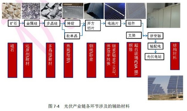 绝大多数人考虑投资光伏产业时,都将目光聚焦在上述的主产业链上。其实,除了上述主产业链外,光伏制造还有一条辅材产业链,这些辅材环节的生产对于竹产业链同样非常重要,例如坩埚、石墨、碳毡、铝浆、银浆、超白玻璃、EVA膜、铜箔带、铝合金已经工业气体等材料的生产制造,这些辅料环节无论是产量还是质量,都与光伏主产业链息息相关。图7-4列出了围绕着光伏产业链的辅材环节。