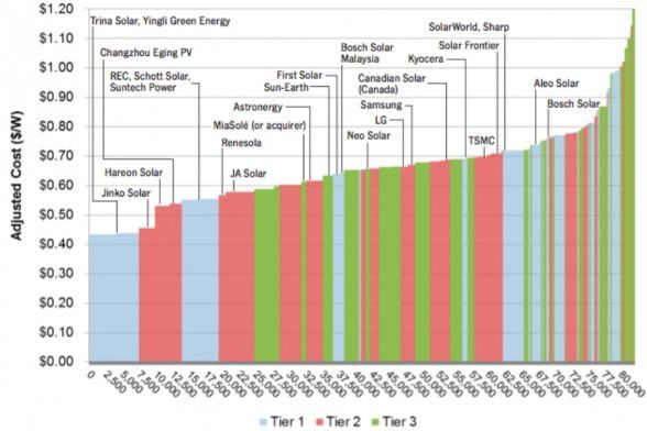此外,Mehta强调由于产能过剩和价格下跌,组件制造商无法凭借一般组件产品的销售扭转目前的局面。他还表示只有不多的几家顶级制造商能在2015年前降成本控制到每瓦0.45美元以下,例如英利和天合。