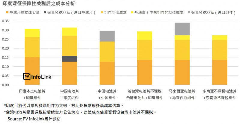 观察印度与中国本土的整体组件成本:印度制造商除了产能大多未如中国厂商形成大量规模化以外,生产良率、以及电池片或组件的转换效率相比中国也出现些微差距,故生产成本并不特别低。