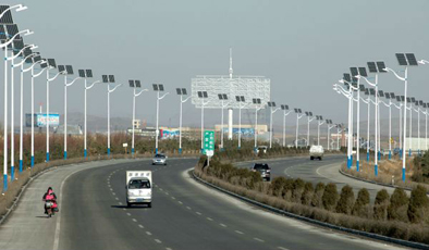 资料图:汽车行驶在安装了太阳能路灯的锦州市渤海大道上
