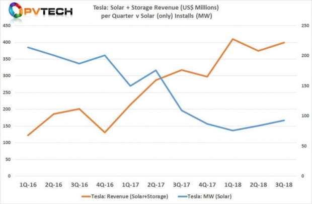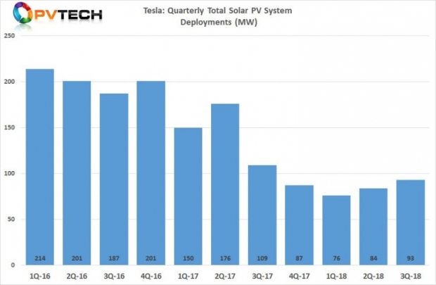 特斯拉表示,2018年三季度太阳能项目装机总量为93MW,比上一季度(84MW)高出11%,这是自2017年四季度以来的最高装机量数据,但仍低于去年同期(107MW)水平。