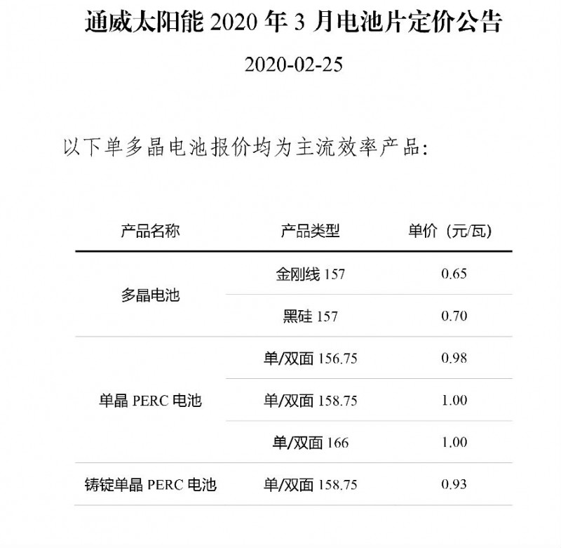 3月25日晚间,在隆基股份发布硅片4月份报价之后,电池龙头通威太阳能发布电池价格,每瓦价格全线下调3-7分钱,其中156.75单晶PERC电池降幅最大,从3月0.98元/W降至0.91元/W。