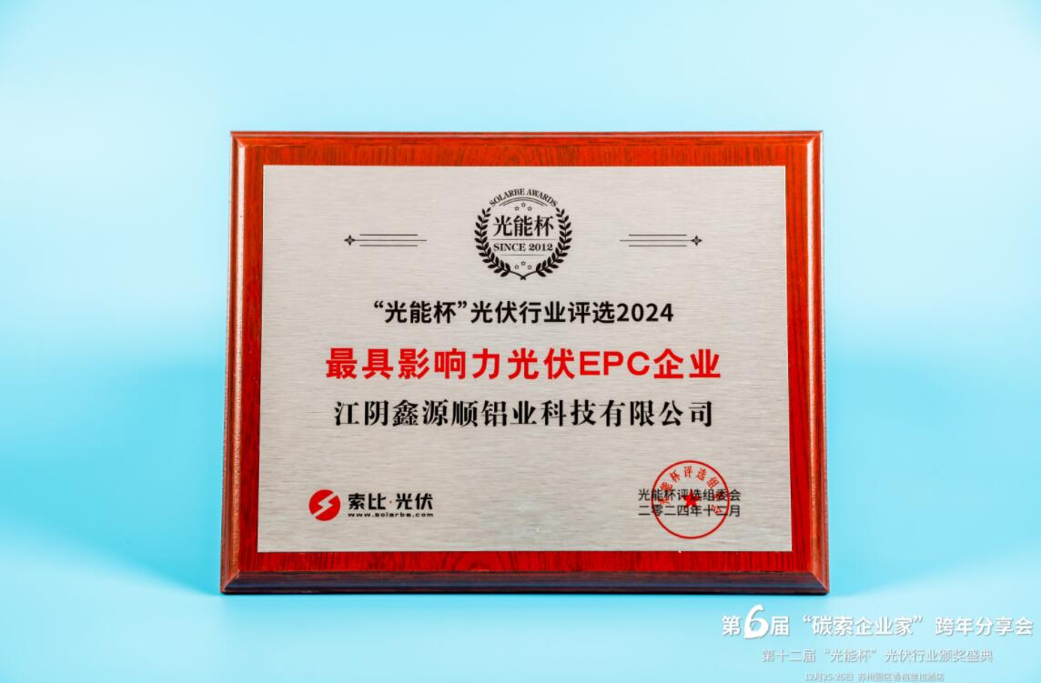 本届“光能杯”共有300余家光伏企业参与报名评选,角逐年度荣誉,线上投票数超13W。此次颁奖盛典中,江阴鑫源顺铝业科技有限公司凭借强大创新力、出色的品质与服务、卓越的品牌影响力,荣膺2024年度最具影响力光伏EPC企业奖。