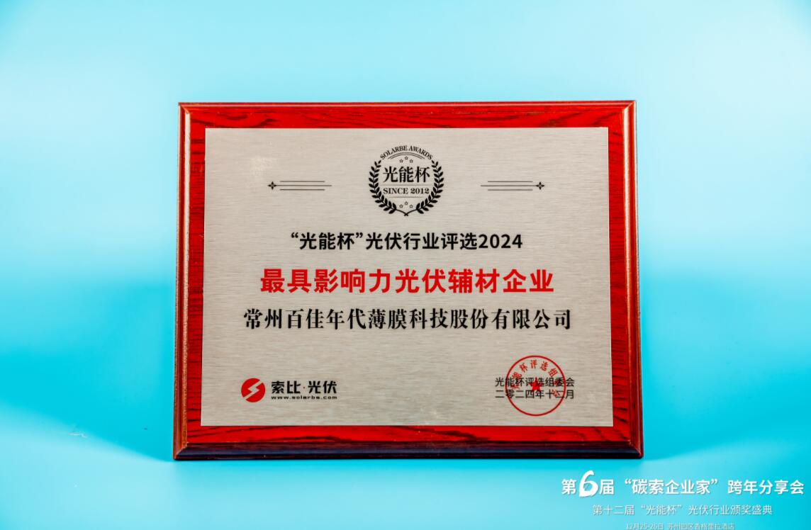 本届“光能杯”共有300余家光伏企业参与报名评选,角逐年度荣誉,线上投票数超13W。此次颁奖盛典中,常州百佳年代薄膜科技股份有限公司凭借强大创新力、出色的品质与服务、卓越的品牌影响力,荣膺2024年度最具影响力光伏辅材企业奖。