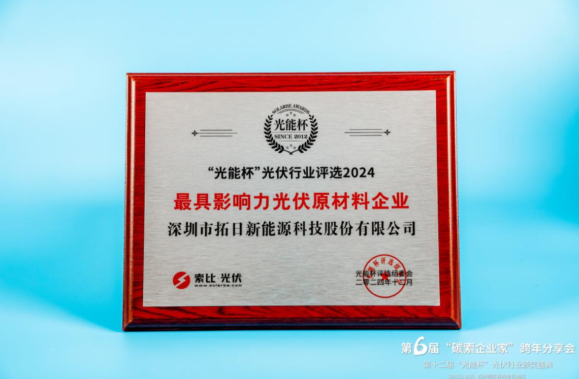 本届“光能杯”共有300余家光伏企业参与报名评选,角逐年度荣誉,线上投票数超13W。此次颁奖盛典中,深圳市拓日新能源科技股份有限公司凭借强大创新力、出色的品质与服务、卓越的品牌影响力,荣膺2024年度最具影响力光伏原材料企业奖。