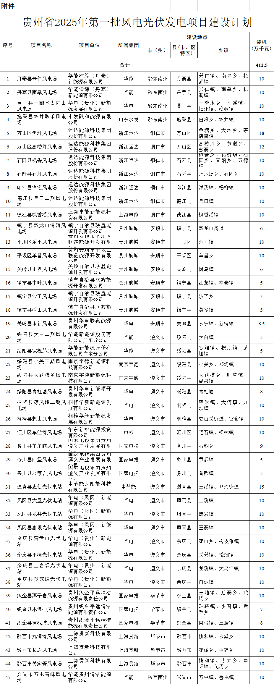 3月27日,贵州能源局下发《2025年第一批风电光伏发电项目建设计划的通知》,总计45个风、光项目,规模4.125GW,其中光伏850MW、风电3.275GW。