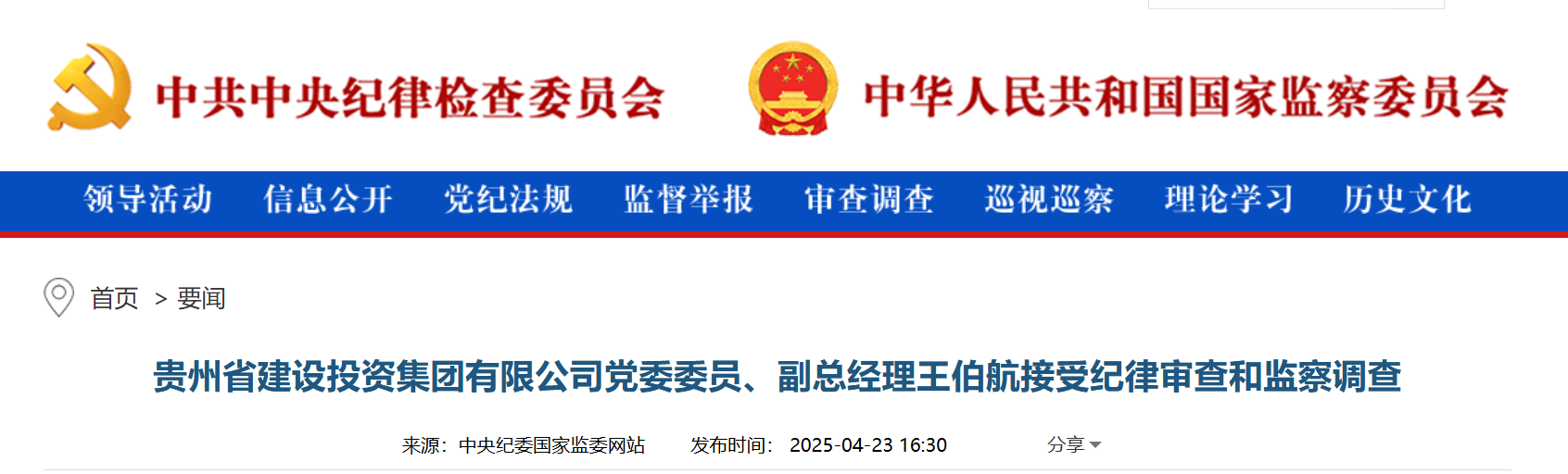 中央纪委国家监委网站4月23日消息,据贵州省纪委监委消息:贵州省建设投资集团有限公司党委委员、副总经理王伯航涉嫌严重违纪违法,目前正接受贵州省纪委监委纪律审查和监察调查。