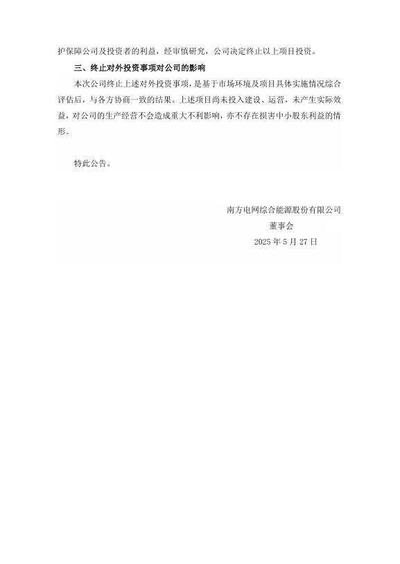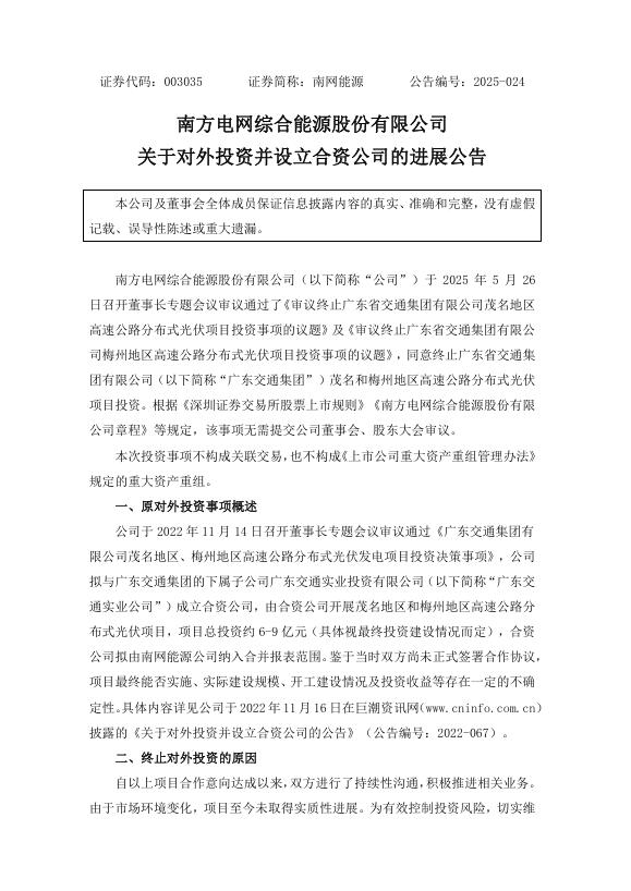 5月26日,南方电网综合能源股份有限公司(以下简称“南网能源”)发布公告,宣布终止广东省交通集团有限公司茂名地区及梅州地区高速公路分布式光伏项目的投资事项。