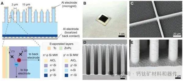 该界面还包括一种薄的氧化铝(AlOx)钝化层,防止转移的电荷载流子在硅表面立即重新组合,以及作为电子供体材料的锌酞菁(ZnPc)层。“为了最大限度地减少背面的复合,添加了一个结深为1 μm的背表面场(BSF)层和一个局部背接触,”科学家们说。“微网格电极用作前电极,以有效地收集载流子。”