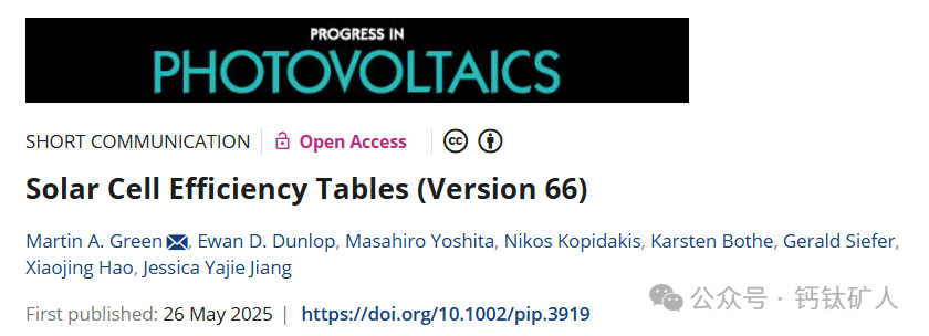 马丁·格林最新太阳能电池效率排行榜发布!随着科技的不断进步,太阳能电池的效率也在不断刷新记录。让我们一起来关注这一领域的最新进展!相关钙钛矿电池效率展示如下:该论文近期以“Solar Cell Efficiency Tables (Version 66)”为题发表在顶级期刊Progress in Photovoltaics: Research and Applications上。重点关注: