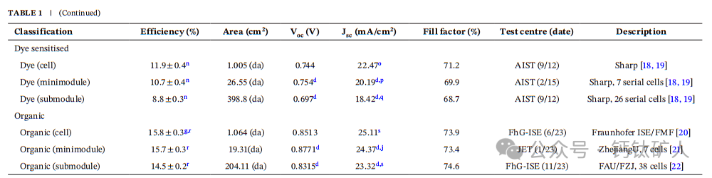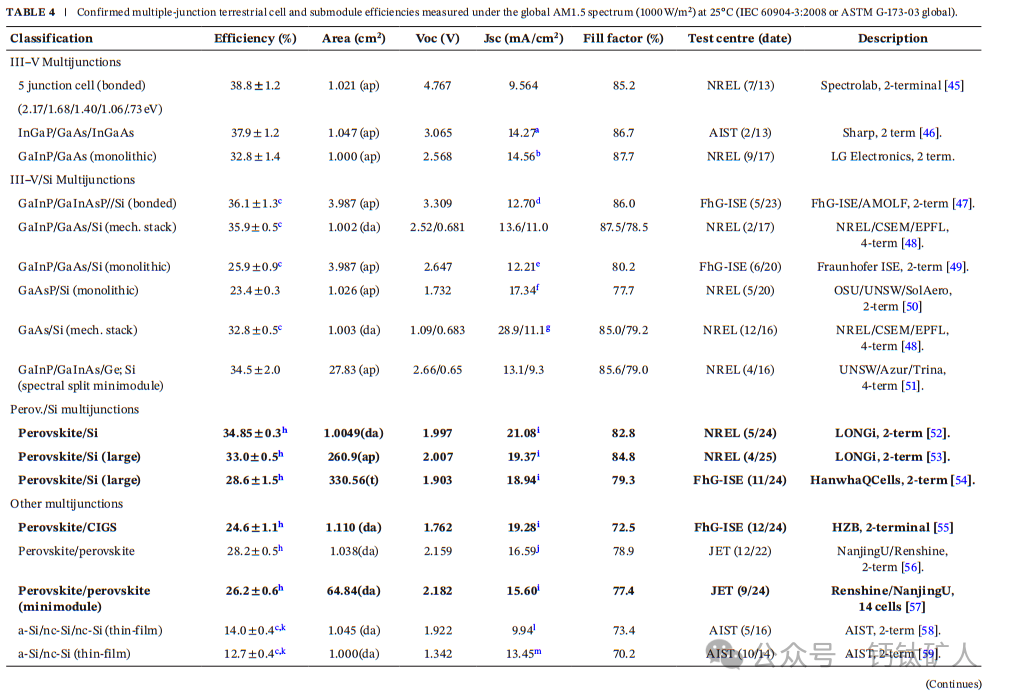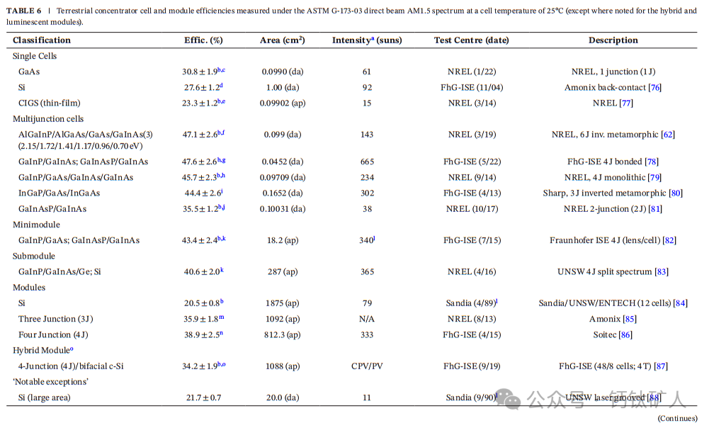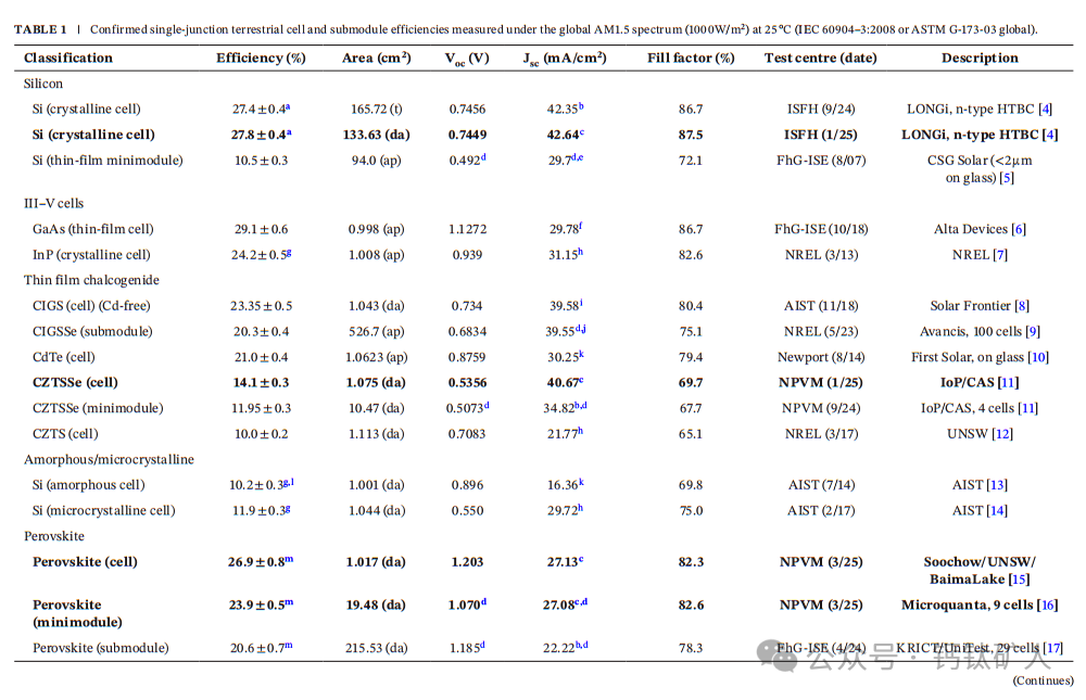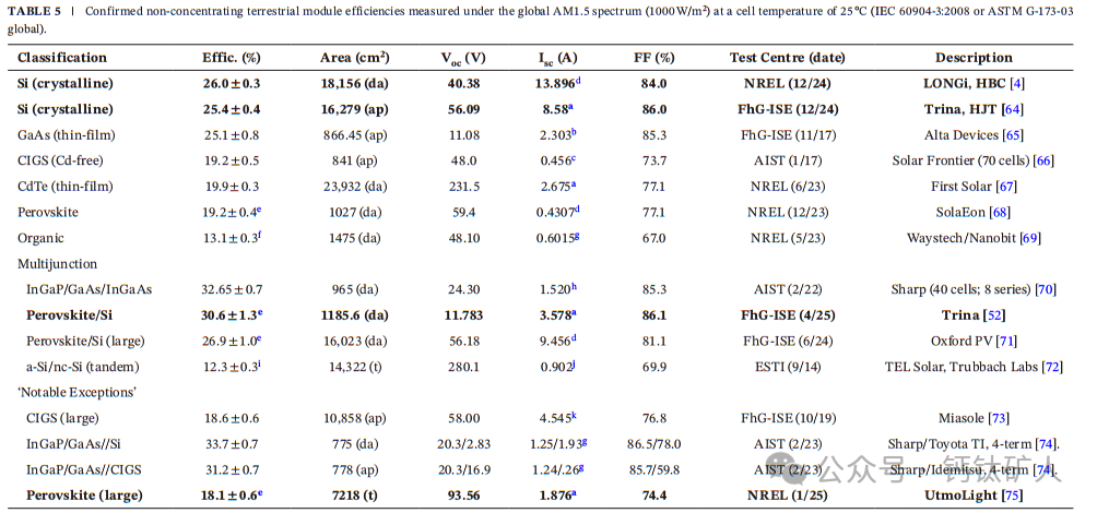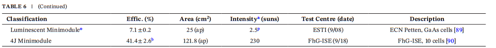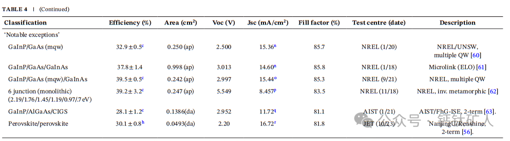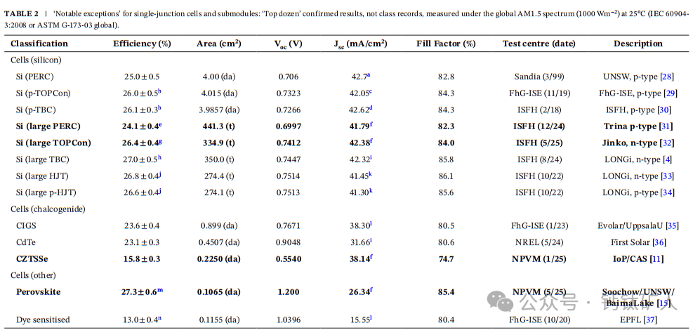 表2. 单结电池和子模块的“值得注意的例外情况”:在25°C下在全球AM1.5光谱(1000 Wm−2)下测量的“前十名”确认结果,而非类别记录(IEC 60904- 3:2008或ASTM G-173-03 global)。