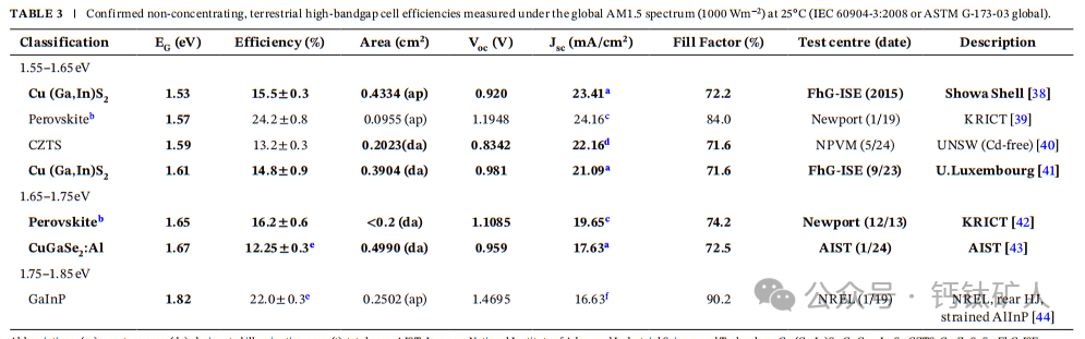 表3. 在25°C全球AM1.5光谱(1000 Wm−2)下测量的非集中地面高带隙电池效率(IEC 60904-3:2008或ASTM G-173-03 global)。