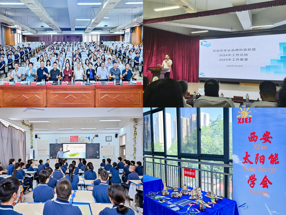 2025年5月28日,在西安市东城第一中学,西安太阳能学会作为协办单位,参加了由西安市科学技术协会指导,西安市灞桥区科学技术协会、西安市学会品牌科普联盟联合主办的“2025年丝路科普暨西安市学会品牌科普联盟年会”,这也是2025年“全国科技工作者日”系列活动的重要组成部分。活动中,学会理事长成珂作为西安市学会品牌科普联盟负责人,汇报了联盟2024年工作成果和2025年工作计划。学会常务理事郭忠民,面向该校初一年级学生,开展了《开采阳光,绿色梦想》的科普讲座。同期,学会还展出了“绿色低碳科技”科普教材,学会副理事长刘全铭、秘书长王忆麟、常务理事周毓明、理事李西京和冯佩莉等参加了活动。