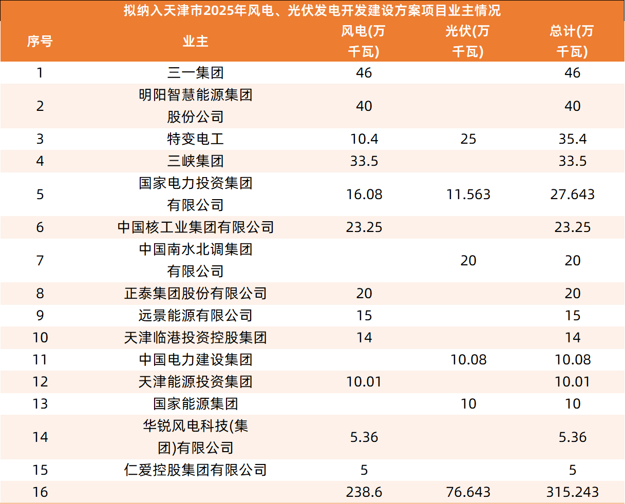 根据项目清单,本次共有21个风电、光伏项目拟纳入天津市2025年开发建设方案,新能源容量总计315.243万千瓦。其中风电规模238.6万千瓦,光伏规模76.643万千瓦。