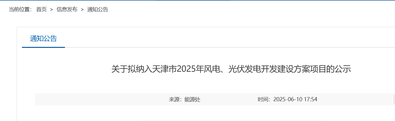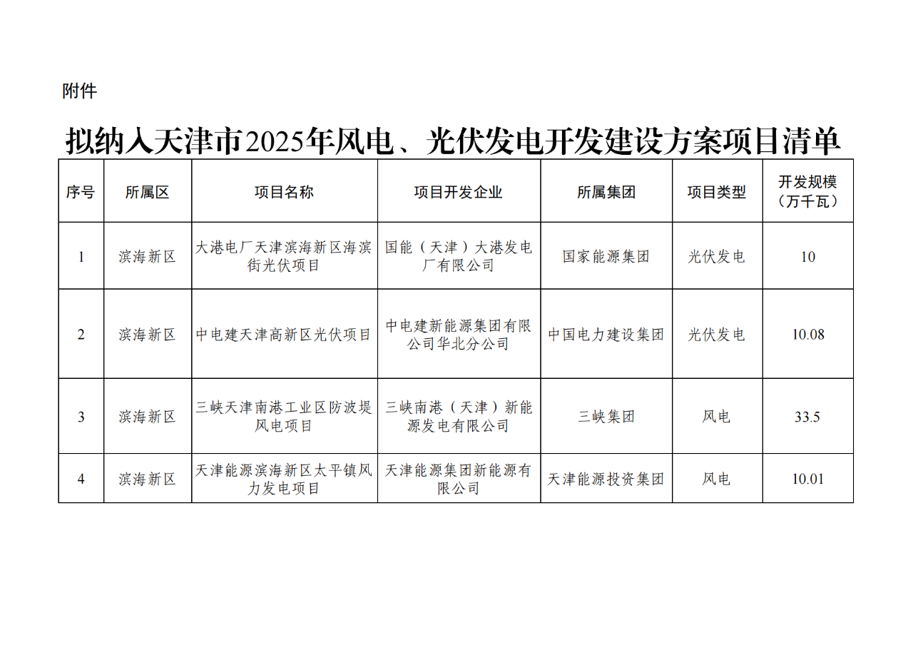 6月10日,天津市发改委公示拟纳入天津市2025年风电、光伏发电开发建设方案项目。