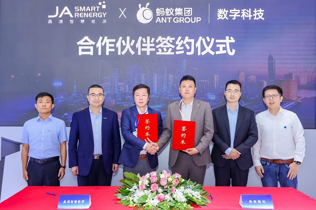 会中,晶澳智慧能源BG总裁施俊与蚂蚁数科代表完成AI智能体合作签约,双方出席领导共同见证本次合作。