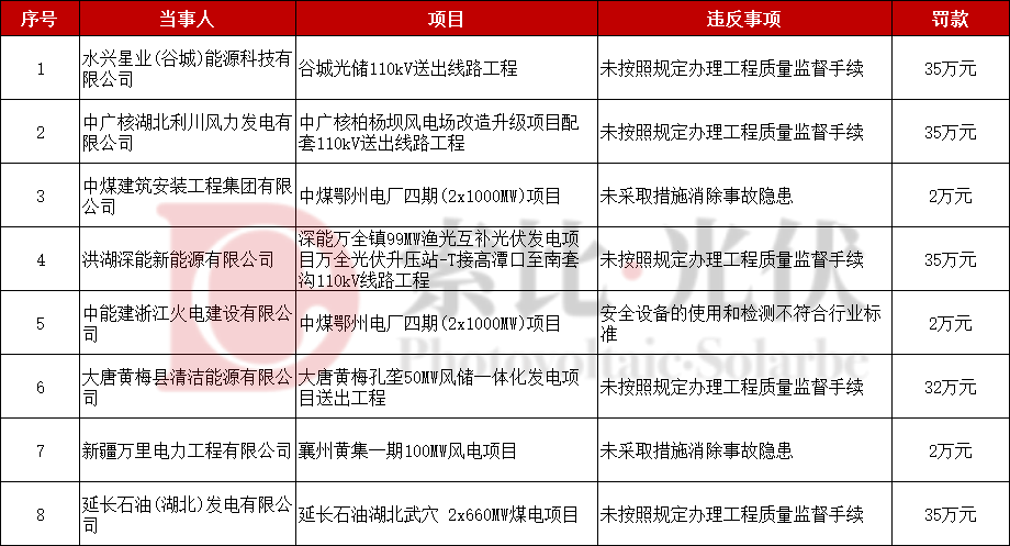 其中,2个光伏、2个风电、1个煤电项目因未办理工程质量监督手续被罚,1个风电、2个煤电项目存在安全事故隐患。