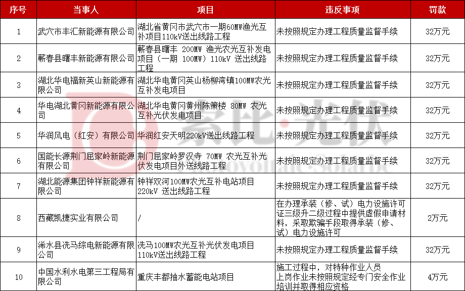 此前,5月21日,国家能源局华中监管局发布行政处罚决定书,涉及三峡旗下企业2家、华电旗下企业2家以及华润、国家能源集团、湖北能源集团、中国电建旗下等共计10家企业,累计处罚金额达262万元。
