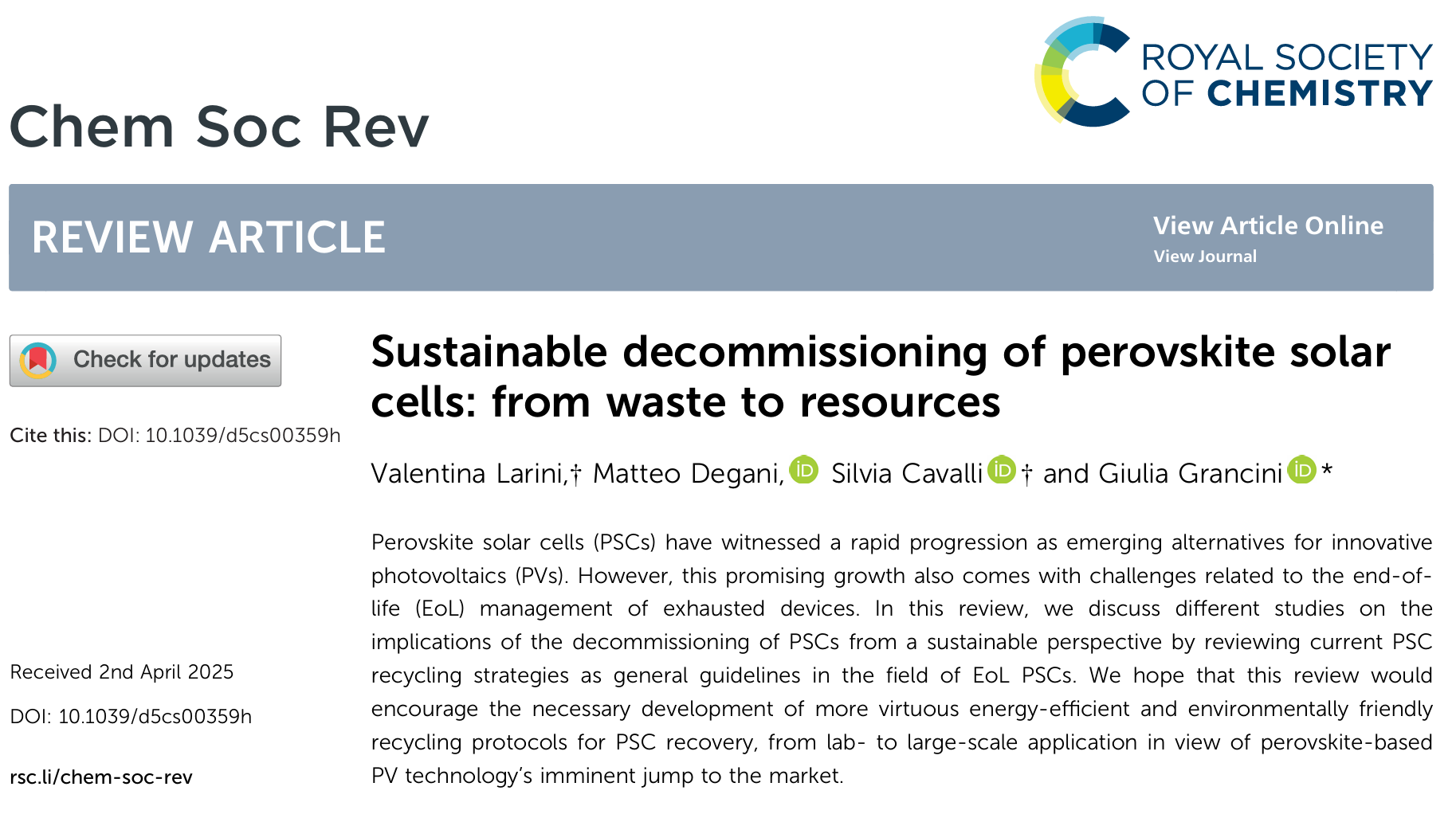 本研究由意大利Grancini课题组主导,从“绿色回收”与“循环经济”的角度出发,系统梳理了当前钙钛矿电池回收策略与环保评估,为未来绿色能源技术的可持续发展提供了重要参考。