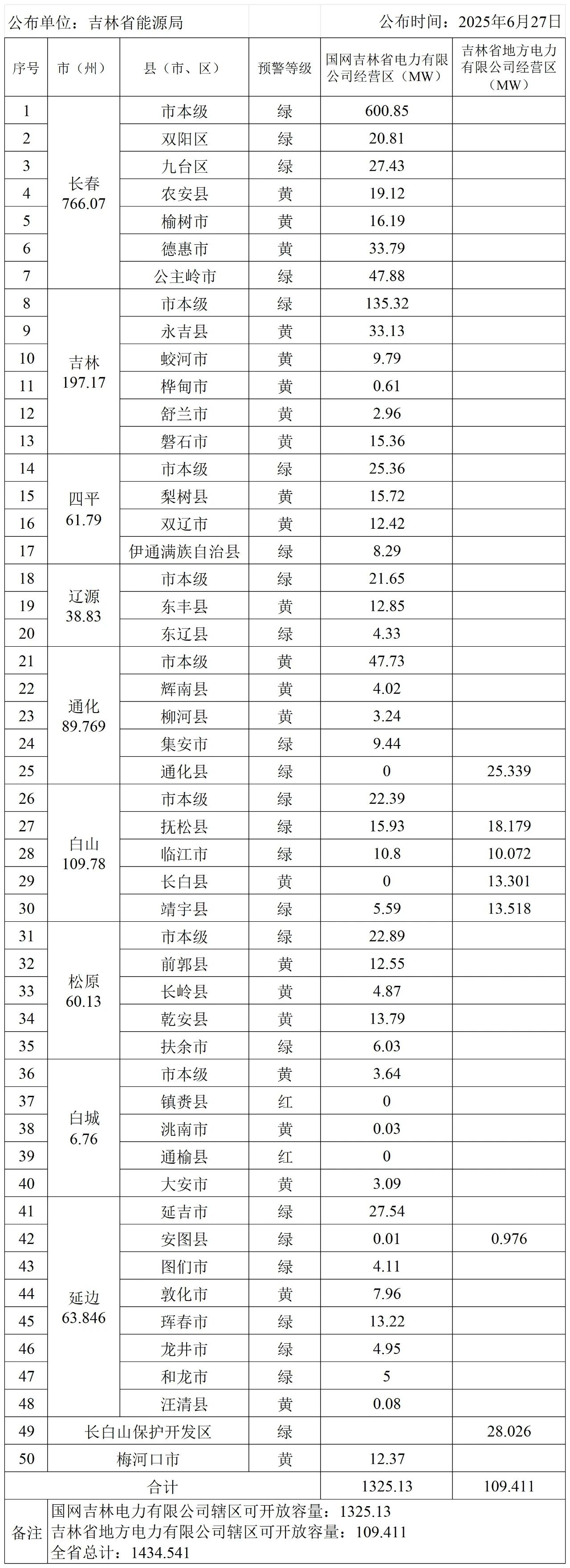 根据国家能源局有关文件要求,结合工作实际,我局组织国网吉林省电力有限公司、吉林省地方电力有限公司测算分布式光伏2025年3季度接入配电网可开放容量,现将各地容量情况向社会公开,各地能源主管部门、电网企业及投资主体可据此开展工作。