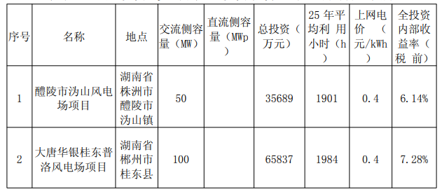 按照国家《“十四五”可再生能源发展规划》和湖南省发改委《湖南省“十四五”风电、光伏发电项目开发建设方案》,加快构建新能源为主体的新型电力系统、全力推进风电、光伏发电高质量可持续发展、助力实现碳达峰碳中和目标,构建以新能源为主体的新型电力系统的要求,推进公司高质量发展,公司拟投资建设株洲市醴陵市沩山风电场项目、郴州市桂东县普洛风力发电项目、衡南县向阳光伏发电项目一期工程。上述项目装机规模共计230 兆 瓦 , 合计项目总投资额约为139,807.51 万元。株洲市醴陵市沩山风电场项目、郴州市桂东县普洛风力发电项目资金来源为资本金 30%,银行贷款 70%,衡南县向阳光伏发电项目一期工程资金来源为资本金 20%,银行贷款 80%。其中株洲市醴陵市沩山风电场项目约为12个月。桂东县普洛风力发电项目建设期约为16个月。衡南县向阳光伏发电项目一期工程建设期约为7个月。