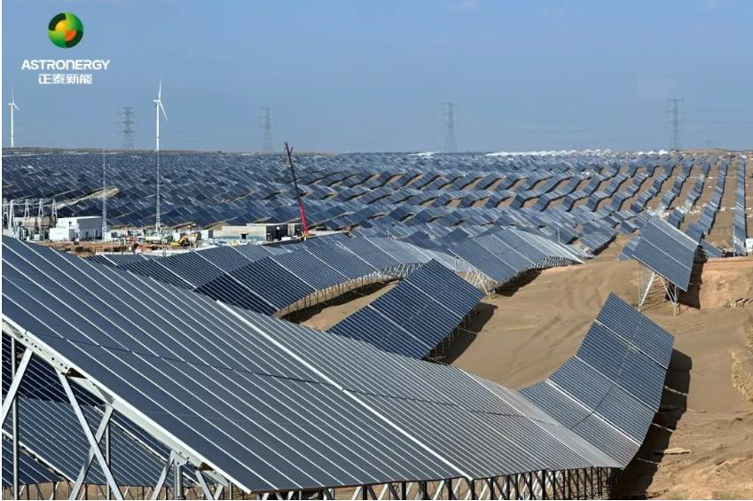 茫茫烈日,石嘴山红崖子乡的沙丘如金浪起伏,由正泰新能供货267MW ASTRO