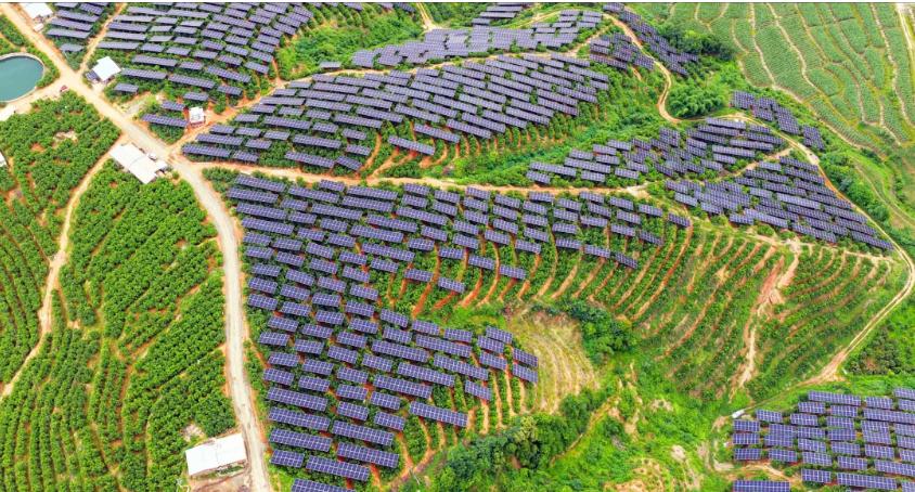 工程建设过程中,项目团队认真研究区域土质特性,采用无人机吊装光伏组件、支架、混凝土等来提升施工效率,进一步确保了光伏组件的精准安装和电站布局的最优化。同时,项目团队通过农林光互补的“灌区+光伏”模式开展建设工作,将果园种植业与光伏发电有机结合,利用成熟果园空间铺设光伏组件,高效实现“板上发电+板下种植”的双绿色生态开发模式,这一举措既提升了土地的利用效率,又推动了当地农业经济的增长。