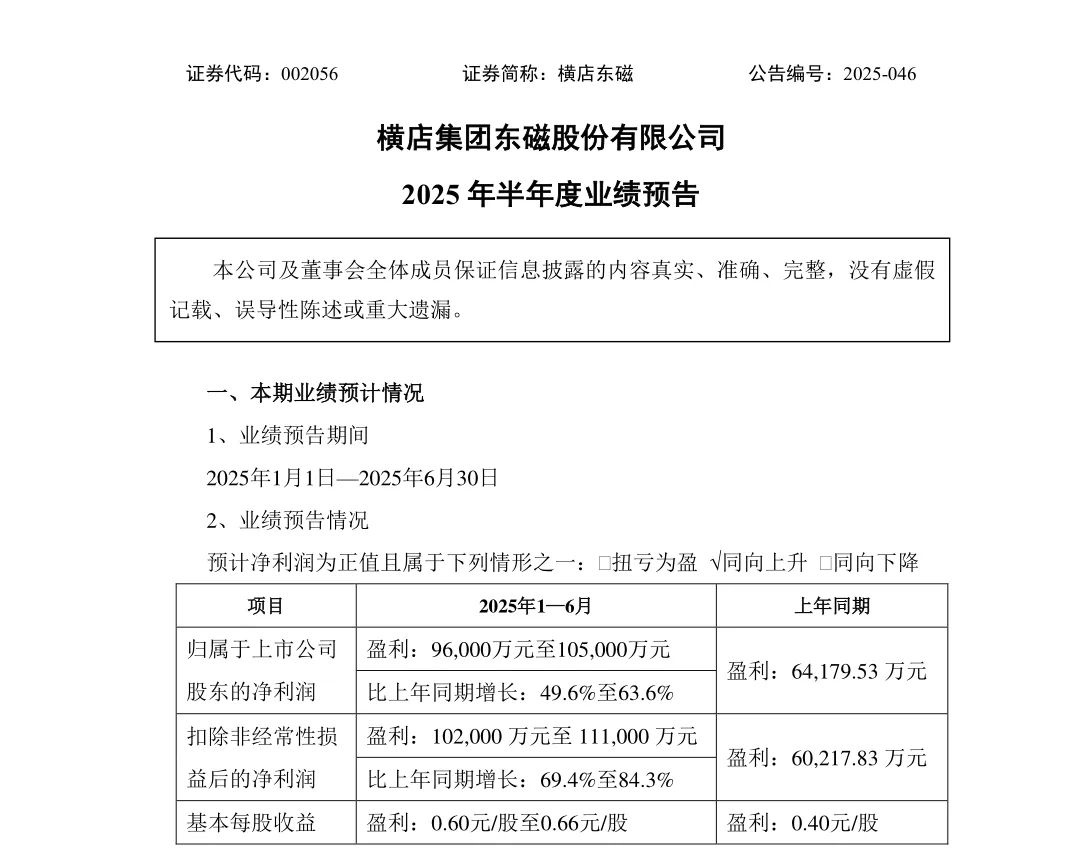 7月14日晚间,横店东磁(002056.SZ)发布2025年上半年业绩预告,预计实现归母净利润9.6亿元至10.5亿元,同比增长49.6%至63.6%;扣非后净利润达10.2亿元至11.1亿元,同比激增69.4%至84.3%。