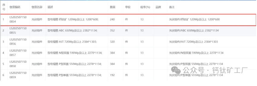 光伏组件清单:P型单面555Wp及以上,192块,2278*1134;P型双面550Wp及以上,384块,2278*1134;N型双面590Wp及以上,384块,2278*1134;HJT720Wp及以上,320块,2384*1134;ABC650Wp及以上,352块,2382*1134;钙钛矿120Wp及以上,248块,1200*600。