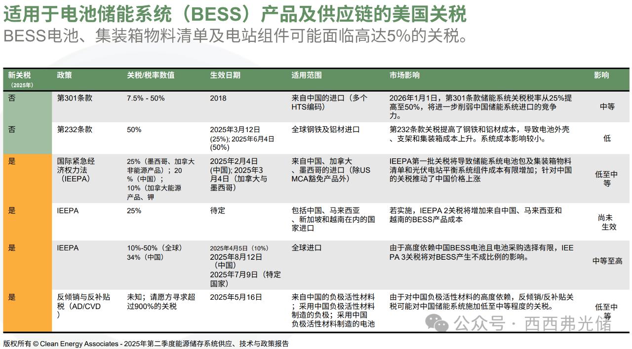CEA的报告明确指出,新的关税和税费是导致21 GWh产能取消的主要原因。美国对来自中国、加拿大、墨西哥以及东南亚(包括马来西亚、新加坡和越南)等地的能源储存系统电池、集装箱物料清单(BOM)和电厂组件征收多项关税,这显著增加了进口成本,也使得本土生产面临更高的成本压力。虽然CEA认为在美国设厂是降低关税风险的最佳选择,但即使是国内电池生产商也可能面临关税风险,这使得投资决策更加复杂。