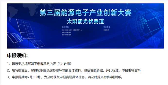 工信部主导的第三届能源电子产业创新大赛太阳能光伏赛道,邀请企业申报优质项目、优质创意和产品及解决方案。