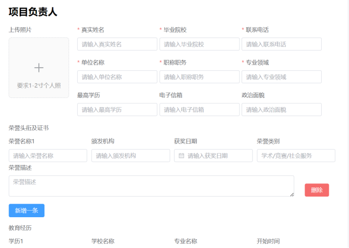 根据要求,填写项目负责人具体信息,带*项为必填项。如有多人需要补充,请选择“新增一条”