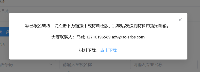 完整信息填写完毕后,点击“提交表单”(提交成功后,弹框中将显示出您所申报赛题对应的介绍、申报表以及评价说明。)